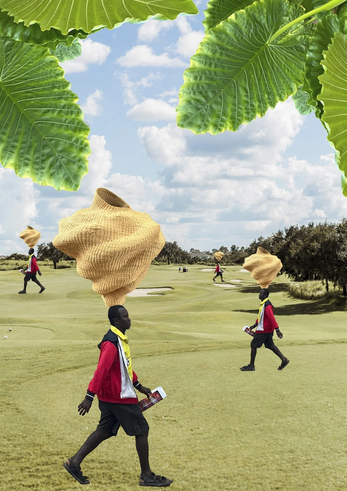 Die Kollagen erforschen nicht nur die haptischen Muster und Knüpfungen der Körbe, sondern auch ihre potenzielle Verbindung zu den straffen, geometrischen Anordnungen der westlichen Industrie- und Fortschrittslandschaft. Die Reise der Körbe findet in den Collagen vorläufig ihren Abschluss im Museum. Hier manifestiert sich der Wunsch und Anspruch von Kusuka, wie ihre Kunstwerke behandelt werden sollen – mit Respekt und angemessenem Verständnis für die Vereinigung von altem, integralem Wissen über Handwerkskunst und Tradition in einem modernen, technisierten Umfeld.